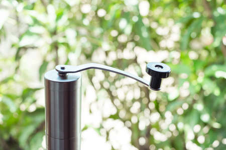 Barista hands on manual grinder coffee for grinding coffee beans with green nature bokeh on background.