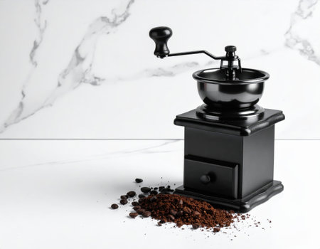 A classic black manual coffee grinder sits on a white marble countertop next to a pile of roasted coffee beans and finely ground coffee