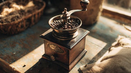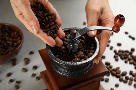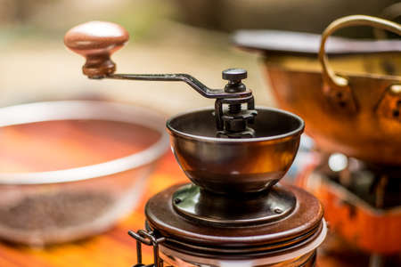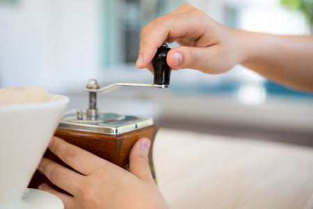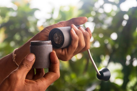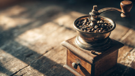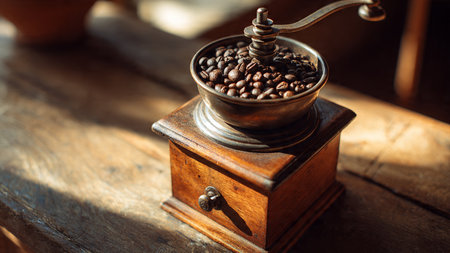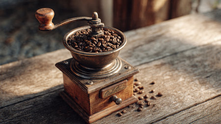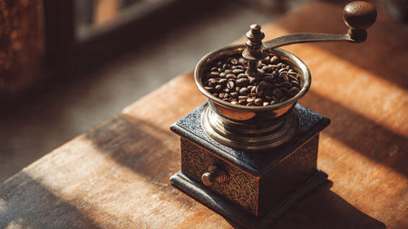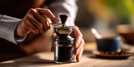 Coffee grinder hand close up barista wooden table coffee cup coffee beans manual grinder kitchen morning light beverage brown