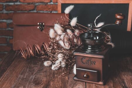 Coffee grinder and coffee beens in burlap decor with dried flower and blackboard on wood table background in dark tone