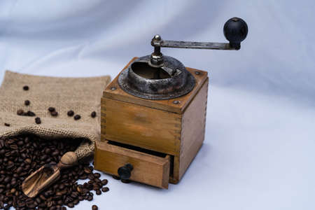 Coffee grinder and spoon with coffee beans, retro filter effect