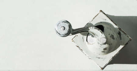 Close-up top of vintage coffee grinder mill handle on a dark background.
