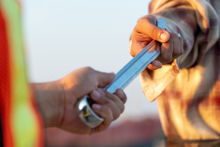 Engineers are submitting equipment to workers. Concepts of teamwork and Respect and trust in working together