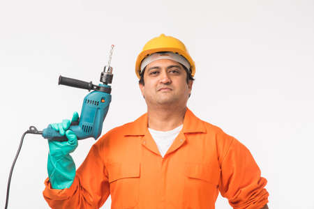 Indian electrician engineer in action with wire cutter, drilling machine etc, standing isolated over white background