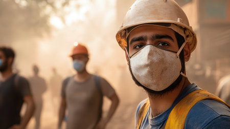 A construction site with workers wearing safety masks surrounded by dust and debris in the air.