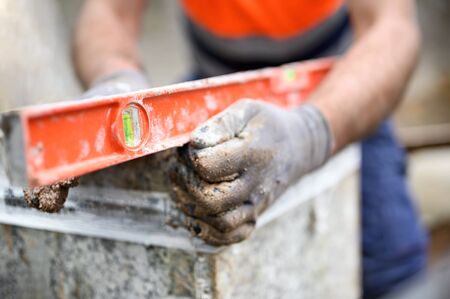 Construction worker checking the bubble level while working at construction site. Building construction.