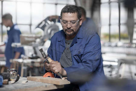 handsome man carpenter in construction safety helmet and checkered shirt on building site with hammer, maintenance