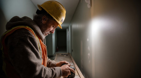 A worker wearing safety gear using a power drill to fasten drywall in a dimly lit room undergoing renovations