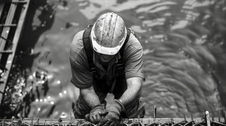 The male engineer worked at the pier, wearing a white hat, raising both hands, strong and powerful to continue working.