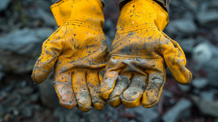 A pair of dirty yellow gloves holding soil, capturing the essence of hard work and outdoor labor in a rugged environment