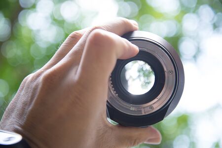 man s hand holding professional digital camera lens. High quality beautiful photo concept