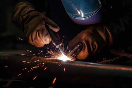 The image captures the intense moment of a craftsman welding metal, showcasing hands wearing gloves, a welding torch, and vibrant sparks in a dynamic industrial setting.