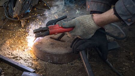 the work of the welding machine in the hands of the welder, welding sparks, industrial background