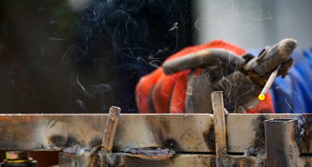 Welder arc Gouging carbon electrode rods with sparks and smoke