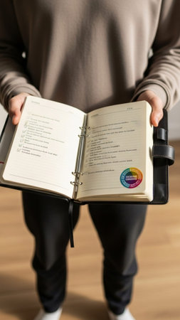 In a quiet, low-lit workspace, a person carefully balances a tall stack of blue folders, showing meticulous organization. The subtle lighting highlights the rich textures of the folders.