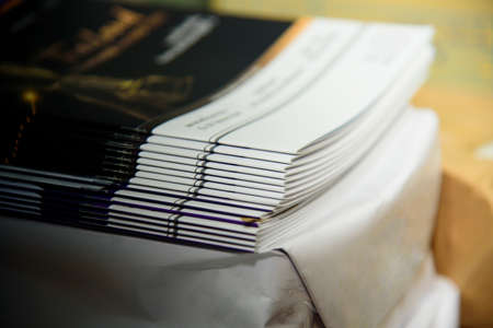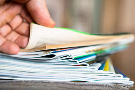 Stack of colorful magazines on the office wooden table. Copy space. Mockup for design.