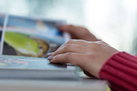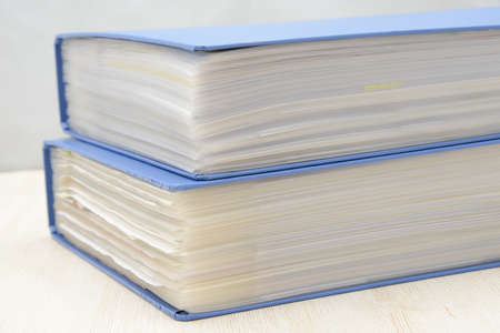 Stack of paper on office desk for report papers . Close up of stack paper. Females hand touching paper, close up view.