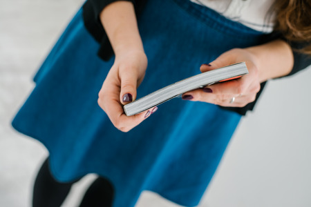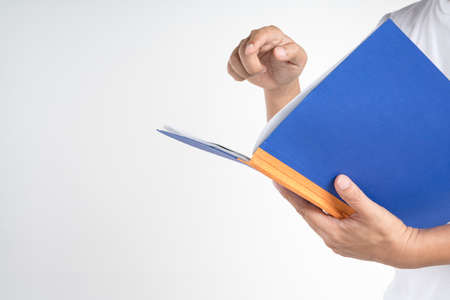 Reading for leisure. Hands take hardback book with empty cover on blue background top view space for text