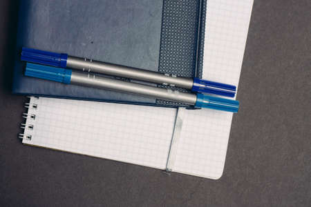notebooks with green cover and fountain pen. On a dark table close-up. Soft focus.