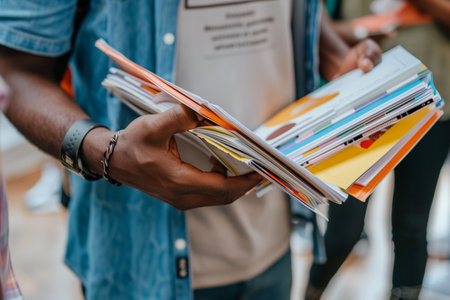 A person holds several stacked files while standing on a bustling street filled with blurred pedestrians. The day appears bright, hinting at an active urban environment.