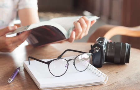 beautiful girl happy to sit reading a book Close-up of female relaxing in coffee shop cup of tea
