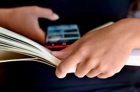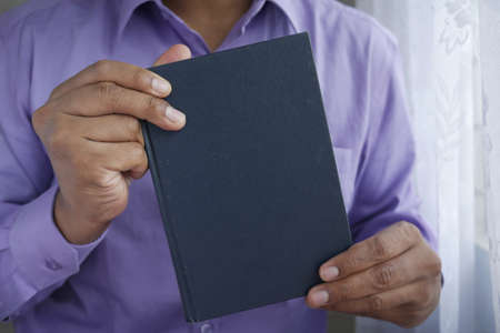 man is reading a book, male hands are holding a book, side view close-up, selective soft focus.