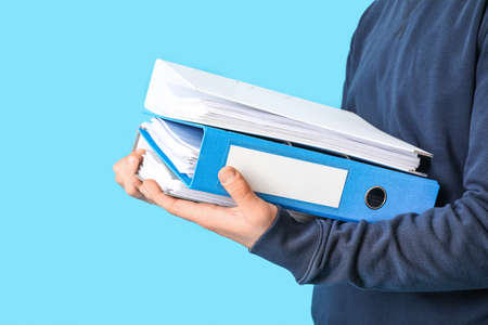 Businessman sorting stacks of department meeting papers, document management in corporate office. Office document management and storage concept.