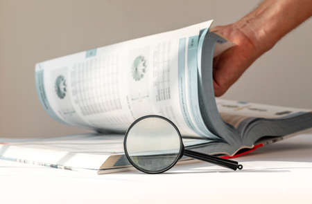 Technical book with turning pages, male hand and magnifier. Engineer research.