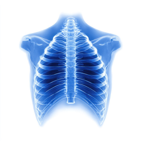 This is a detailed illustration of a human chest anatomy with an x-ray effect, showcasing the ribs and spine. Ideal for medical professionals and educators.