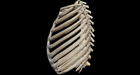 This image showcases a detailed human rib cage against a black background, highlighting the intricate anatomy and structure of the bones for educational and artistic purposes.