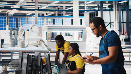 Inspector in solar panel factory review manufacturing equipment and production process, checking documentation files. Black man at facility ensuring eco friendly photovoltaics. Camera B.