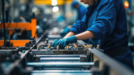 In a state-of-the-art industrial workshop, a technician meticulously adjusts complex machinery. Surrounded by tools, the atmosphere is focused and industrial as dusk approaches.