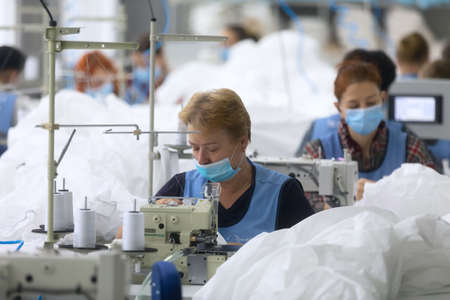 CHERNIGIV, UKRAINE - Oct. 06, 2020: Sewing of protective suits for medics and doctors during covid-19 pandemic in sewing factory TK-Style in Chernigiv, Ukraine