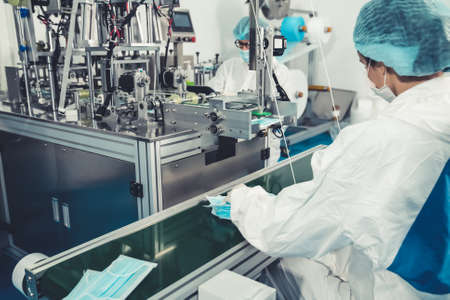 Workers producing surgical mask in modern factory, protection and medical concept.