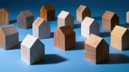 A vibrant scene featuring wooden house-shaped blocks in various colors on a blue background, perfect for educational or creative projects emphasizing play and design.