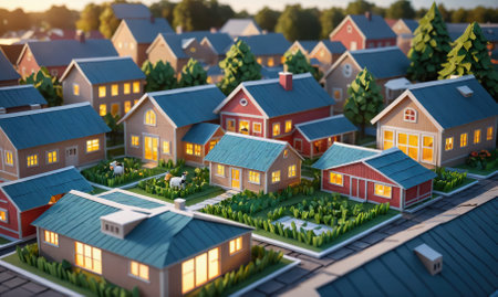 A model of a small town with houses and green gardens lit by warm lamps in the evening
