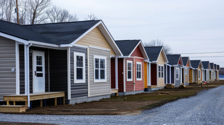 A row of nearly finished modular homes displaying a variety of architectural styles and designs