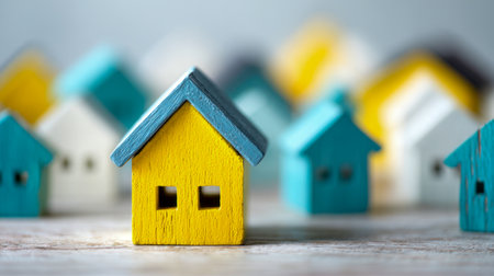 Bright yellow and blue wooden cottages stand in harmony, with softly blurred tiny homes behind them, evoking warmth, neighborhood charm, and belonging.
