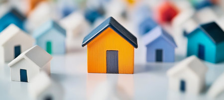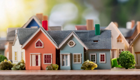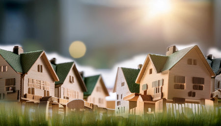 A row of charming, illuminated model homes stands in a perfect line against a vibrant green background. Each house, with its warm lights glowing from within, represents a unique dream of homeownership, community, and suburban tranquility. This idealized neighborhood symbolizes real estate investment, property development, and the concept of finding the perfect place to call home.
