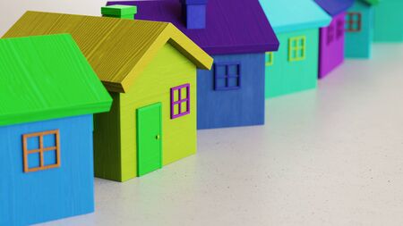 Line of Vibrantly Colored Toy Wooden Houses on Simple Light Grey Surface