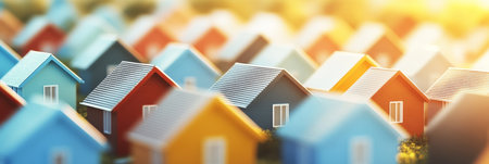 Colorful miniature houses in perfect rows create a whimsical urban cityscape.