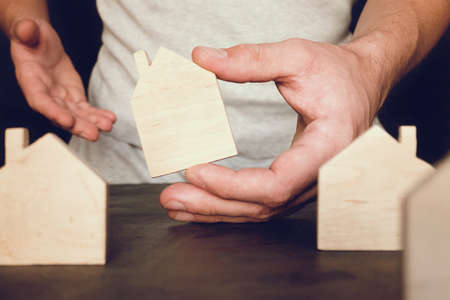Close up hand choosing mini wood house model from a row model. Choose what's the best. A symbol for construction ,ecology, loan concepts.
