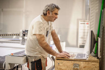 Factory worker technician works on large CNC digital cutter machine for cutting fabric textile material