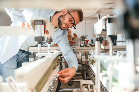 Professional worker machinist engineer technician tuning and programming computer console unit on soft PVC dispensing machine in factory production workplace. Industrial working operating process