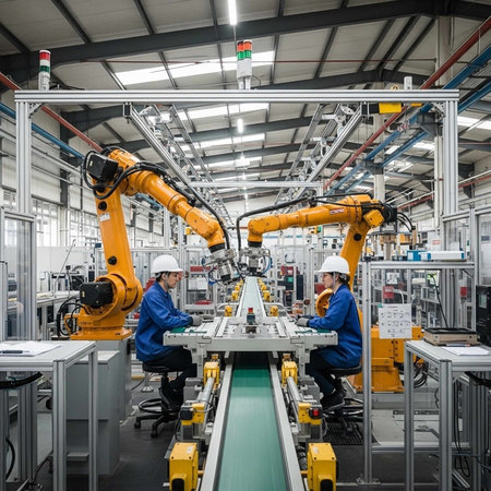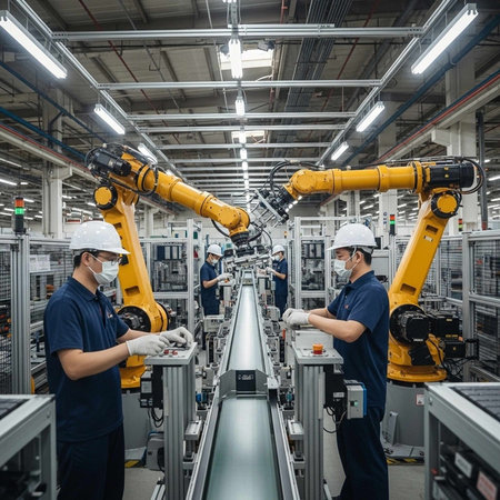 Workers in yellow uniforms operate alongside robotic arms in a modern factory, illustrating industrial automation and human-robot collaboration. High quality photo