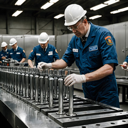 A group of engineers dressed in blue uniforms and white safety helmets are meticulously assembling high-precision components in a well-lit, modern factory. The focus is on one engineer in the foreground who is carefully handling a metal part while others work in the background. The scene emphasizes attention to detail, teamwork, and industrial manufacturing processes.
