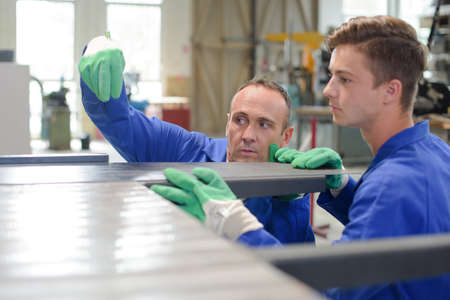 Two skillful factory engineer or worker showing teamwork and partnership . Industrial people and manufacturing labor concept .