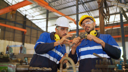 Engineer men wearing uniform safety maintenance in factory working machine lathe metal, Professional worker man.