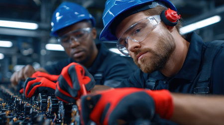 Two engineers diligently assembling precision machine parts in workshop. concept of mechanical engineering, collaboration, industrial innovation, technical expertise.