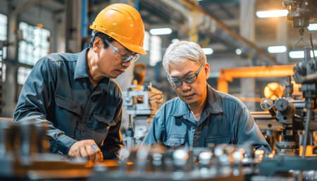 Two men with hard hats working on a machine at a factory, showing their engineering skills and dedication to the job